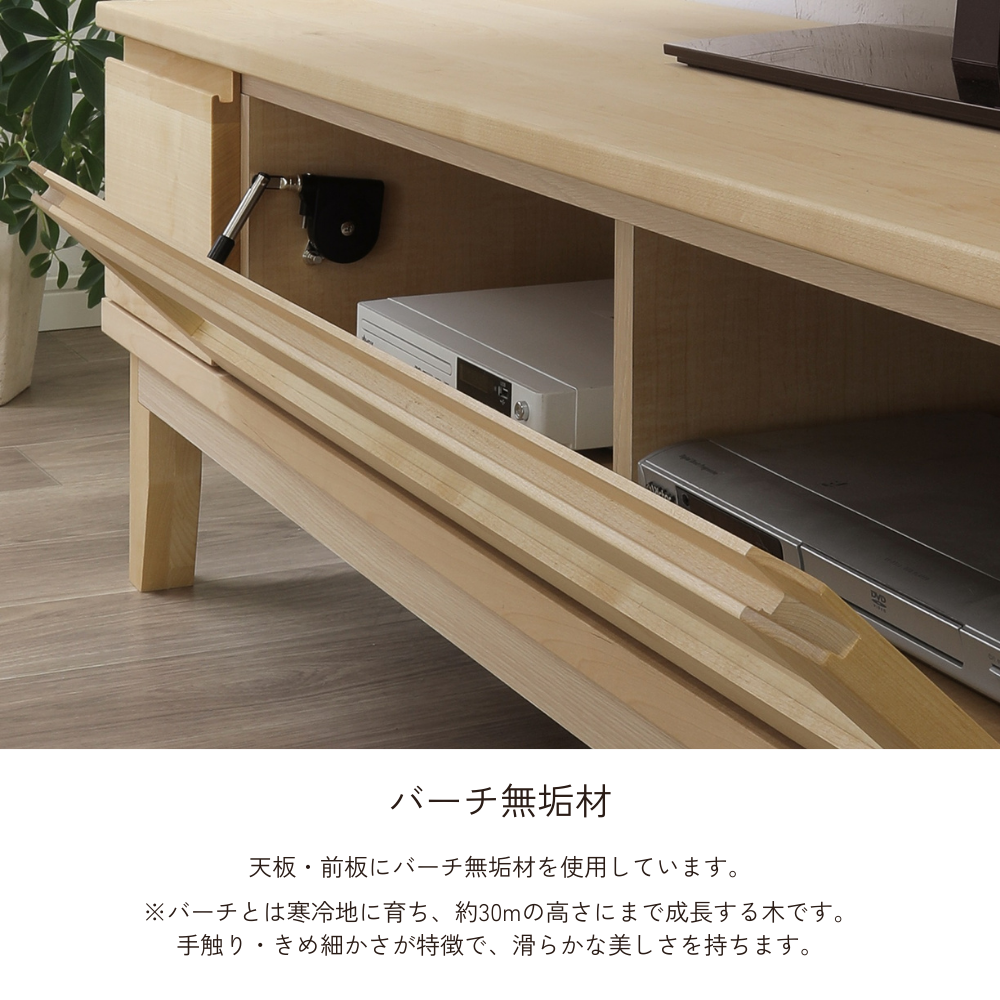 バーチ無垢材を天板と前板に使用し、木の温かみがありながらも高級感あふれる仕上がりに。黄色みが薄く、白系に近いので明るい印象のナチュラルなお部屋づくりに最適です。